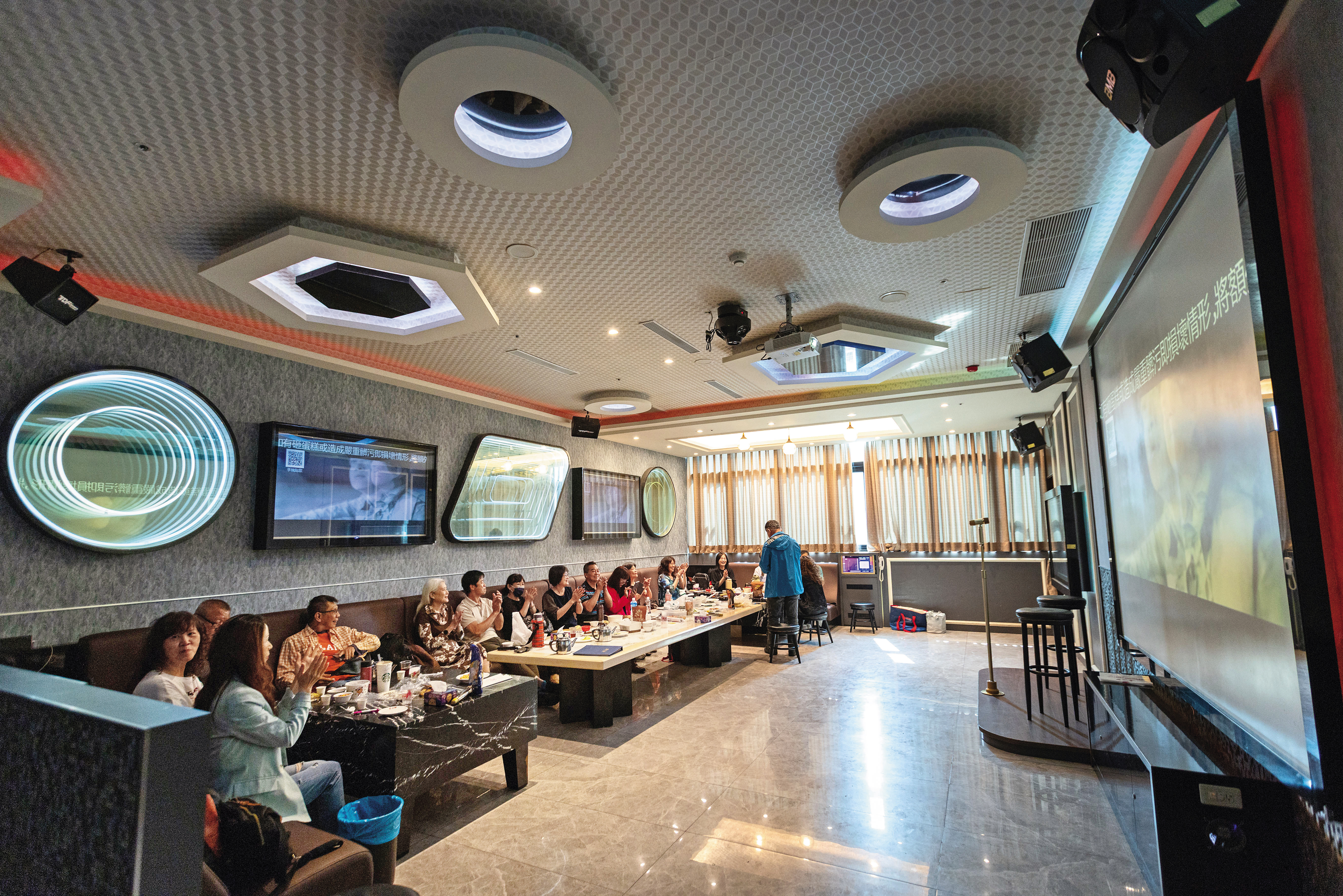 這天是週間上班日的下午2點,本刊隨著李奇霖腳步搭著電梯,來到這間旗艦店的6、7樓、共約10間包廂已經全滿。走進一間足以容納20多人的包廂,挑高的空間、360度環繞音響,裡面坐滿一群退休族點著最新歌單,正高聲歡唱著。「以前是一個月唱3次,現在是一週唱3次,」一位退休長者邊拿出他的手機,邊與本刊採訪團隊說,「享溫馨唱歌群組就有3個。」