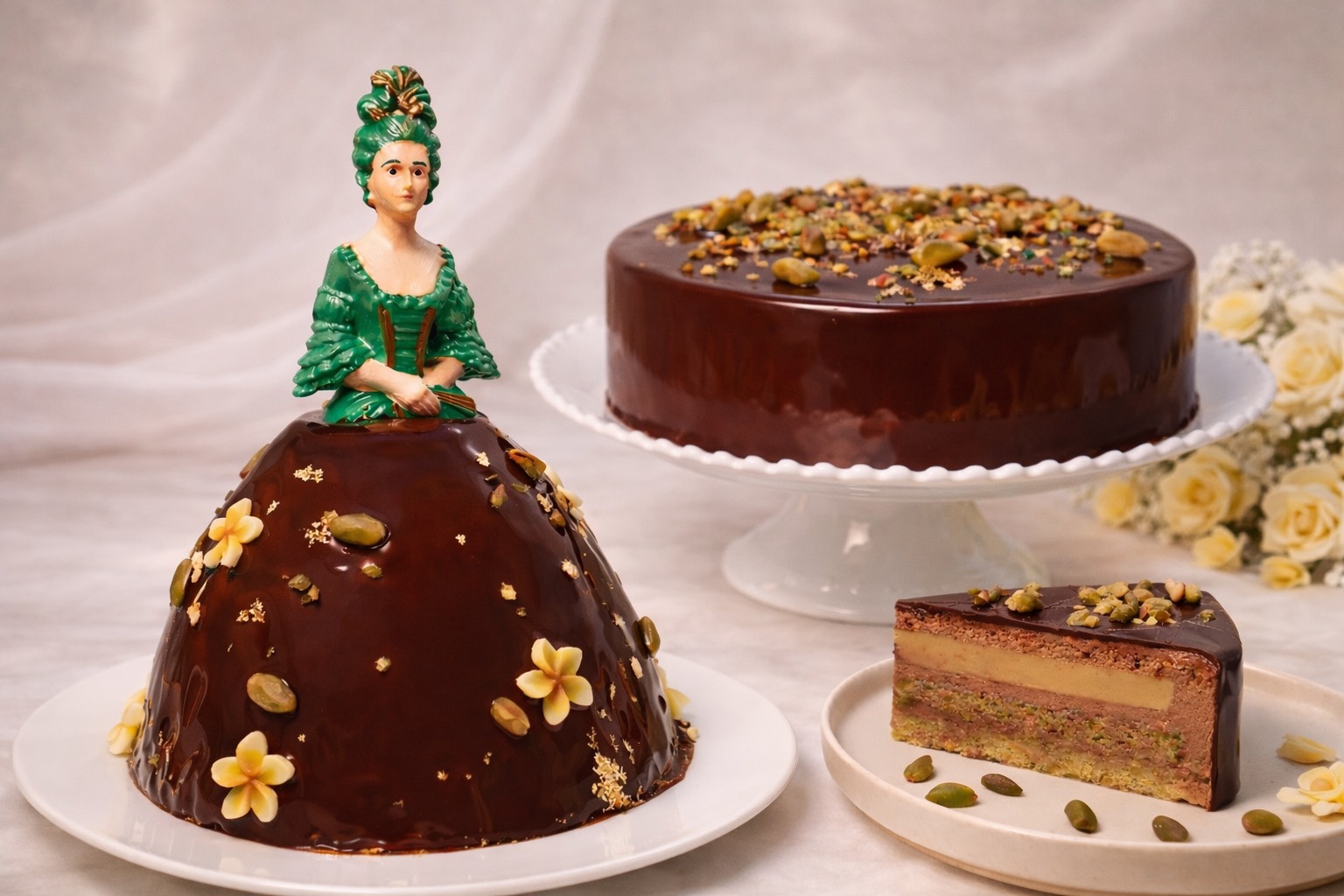 台北晶華酒店今年跟上杜拜巧克力風潮,法籍點心主廚羅倫特別設計了升級版的「3D立體Marquise侯爵夫人「杜拜巧克力風華」以及「杜拜巧克力絲絨」兩款話題母親節蛋糕。「3D立體Marquise侯爵夫人蛋糕」宛如一件可品嘗的藝術作品,視覺上非常搶眼。展開的裙襬是以開心果海綿蛋糕為基底,結合濃郁的杜拜巧克力內餡以及質地滑順的開心果奶油慕斯,外層則包覆光澤細緻的巧克力淋面並點綴開心果碎與巧克力花卉,外層香滑、內層綿密且帶有酥脆餡心的多重風味,數量有限售完為止。