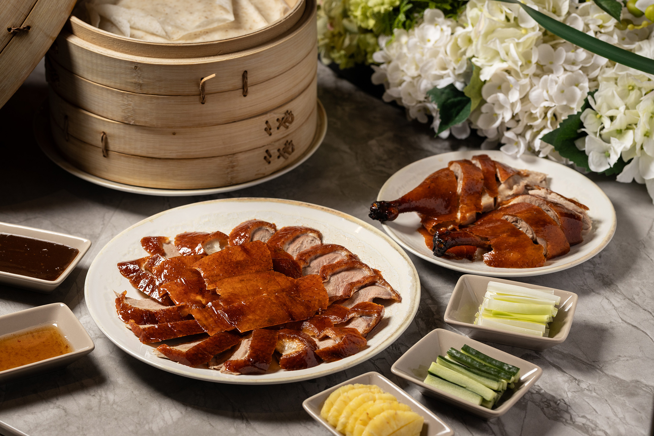 皮要片得稍寬且保留厚度,鎖住豐潤鴨油;另一美味祕訣是醃料,主廚在鴨胚的醃漬醬料加入陳年金棗乾,利用天然酸甜帶出鴨肉鮮甜。包餅也有學問,餐廳捨棄厚重的傳統餅皮,改採特製的薄Q潤餅皮,突顯烤鴨的皮脆肉香。配料方面,主廚在嘗試過梨子、水蜜桃等多種水果後,最終從鳳梨酥得到靈感,選用甜度約70%的台灣鳳梨,利用酵素解膩,讓經典風味多了清爽轉折。