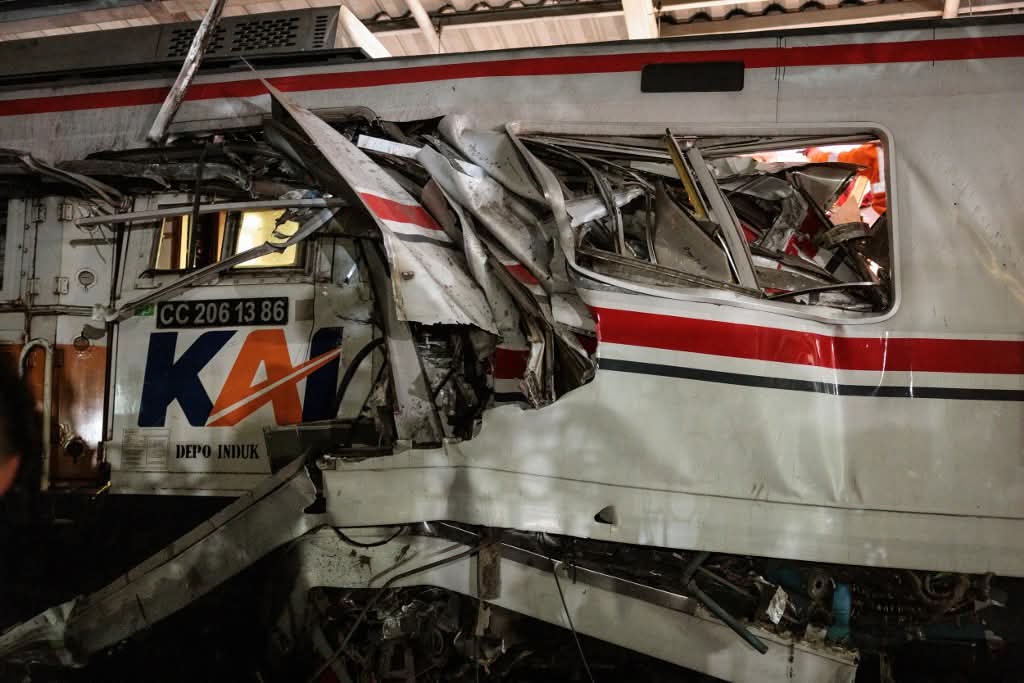 印尼首都雅加達郊外的勿加泗(Bekasi)週一(27日)深夜發生慘烈火車相撞事故,根據印尼國家鐵路公司(PT KAI)最新統計,死亡人數已攀升至14人,另有84人受傷就醫。這起意外發生在繁忙的通勤尖峰時段後,1列通勤列車疑似在軌道上先與1輛隸屬於Green SM Indonesia的電動計程車發生碰撞,導致列車被迫停滯,隨後遭到一列由雅加達開往蘇拉威西方向的「Argo Bromo Anggrek」長途快車從後方猛烈撞擊,造成車廂嚴重毀損扭曲。